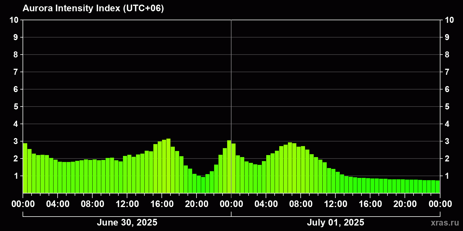 Changes in the auroral intensity index from 2025-06-30 to 2025-07-01 local time