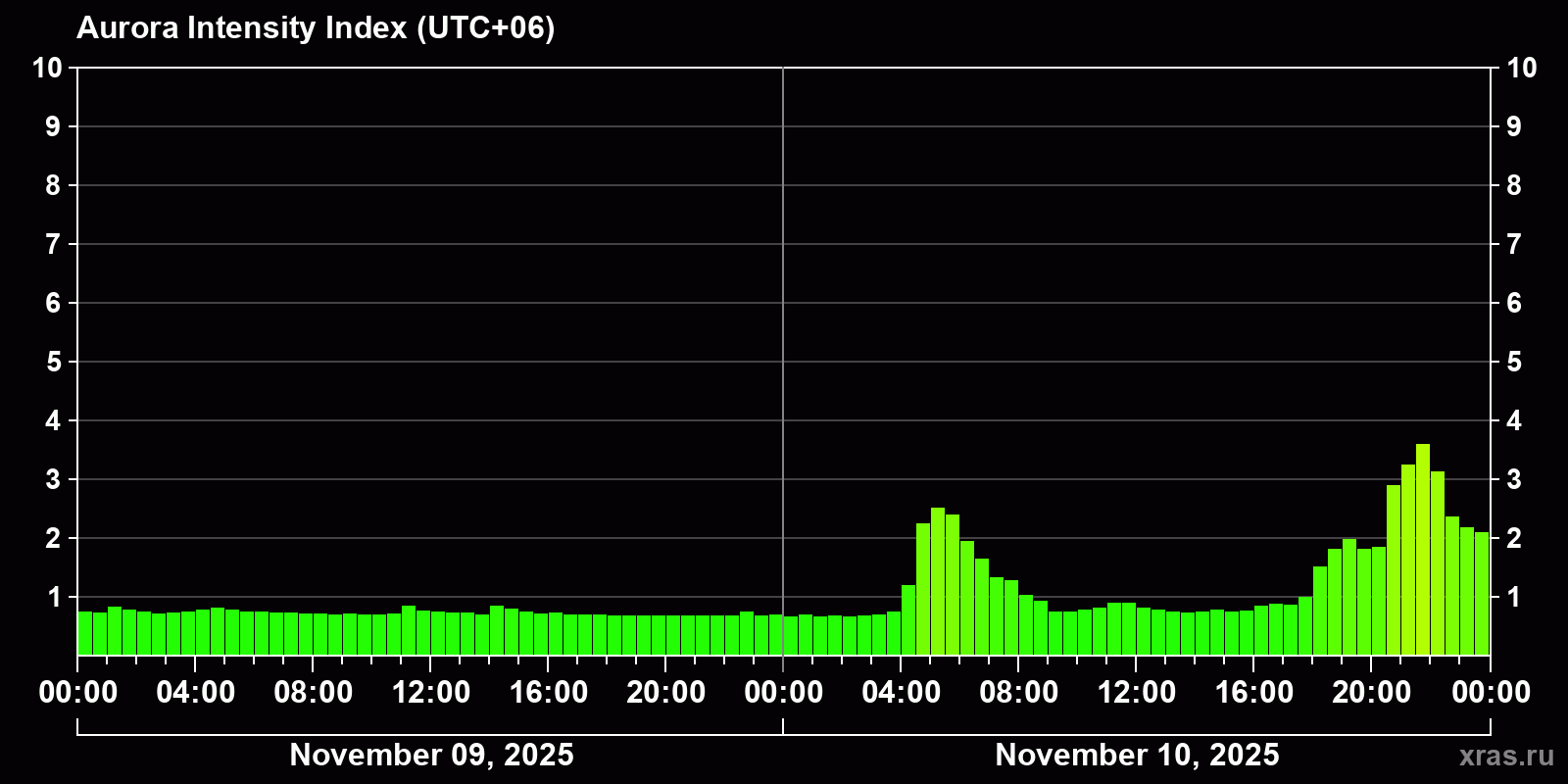 Auroral intensity index and the theoretically possible latitude of observations for nighttime in the Estern Hemisphere as of 2025-11-10 23:59 (end of day) local time