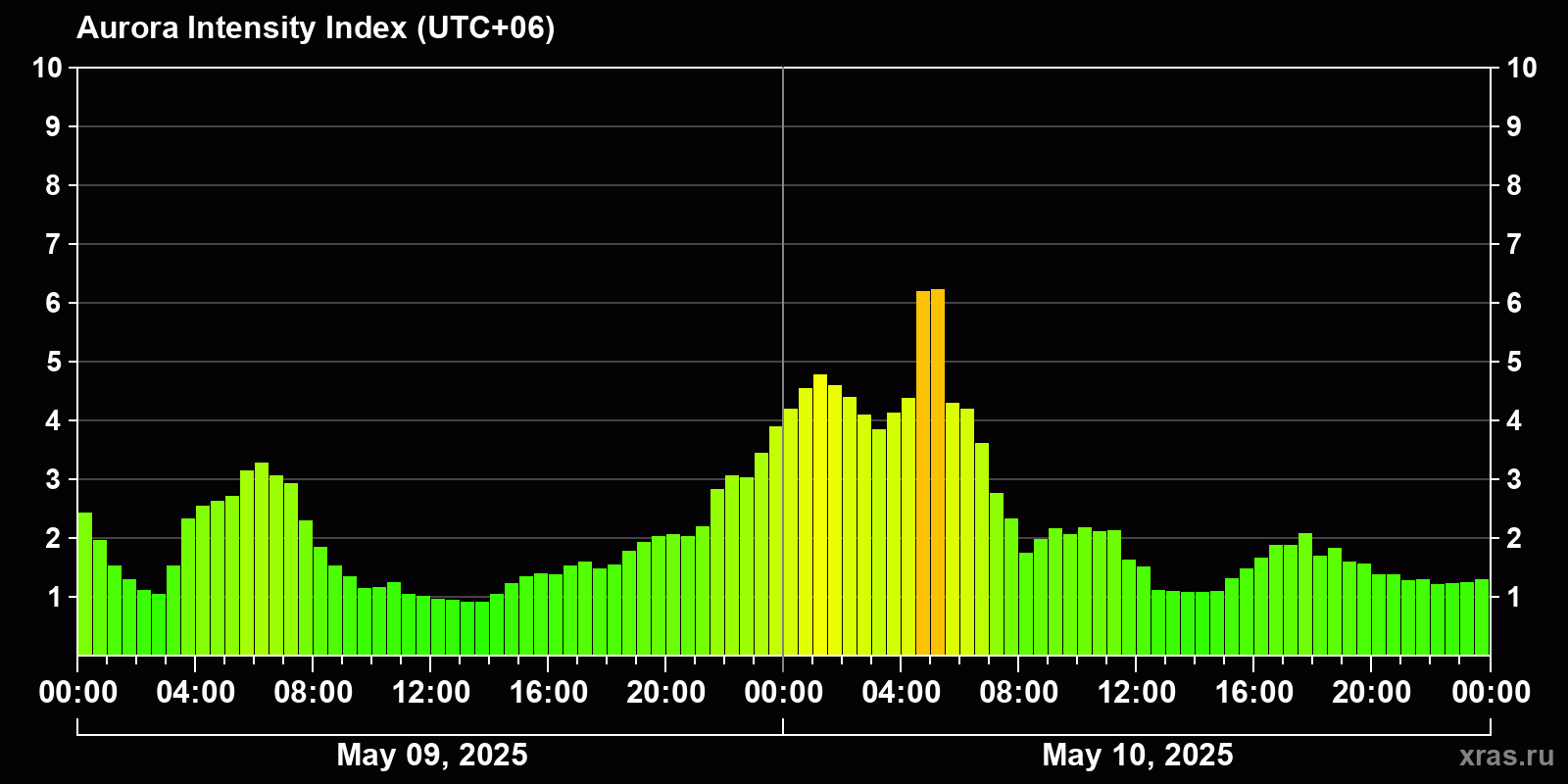 Auroral intensity index and the theoretically possible latitude of observations for nighttime in the Estern Hemisphere as of 2025-05-10 23:54 (end of day) local time
