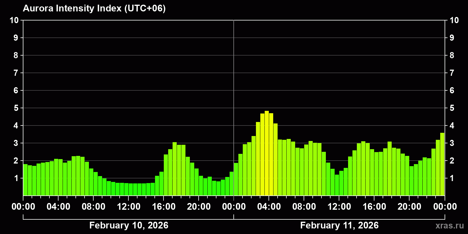 Auroral intensity index and the theoretically possible latitude of observations for nighttime in the Estern Hemisphere as of 2026-02-11 23:50 (end of day) local time