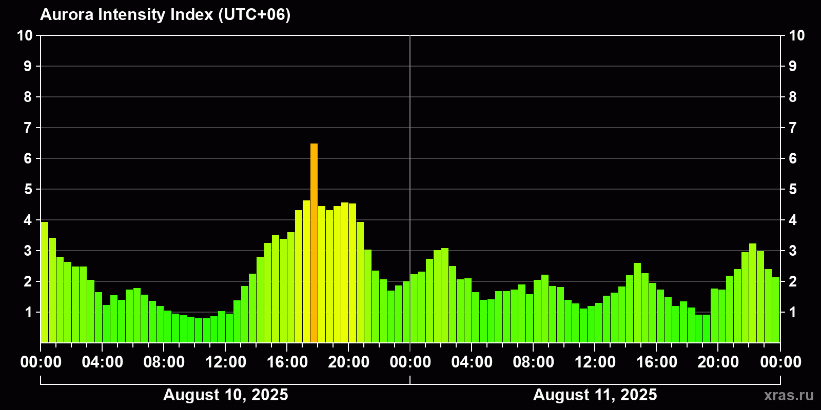 Auroral intensity index and the theoretically possible latitude of observations for nighttime in the Estern Hemisphere as of 2025-08-11 23:49 (end of day) local time