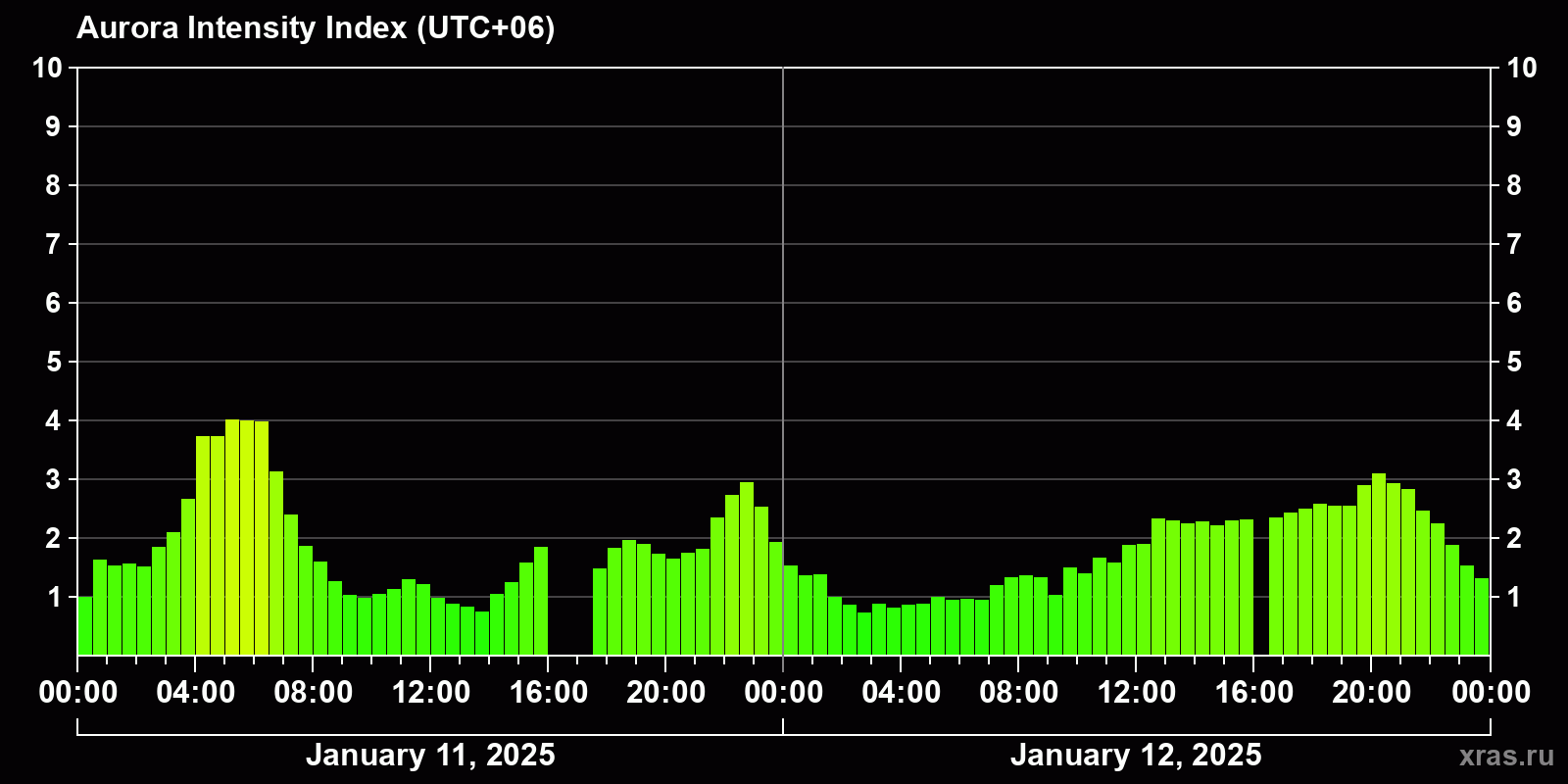 Auroras (northern lights) in Gorno-Altaysk — Jan 12, 2025