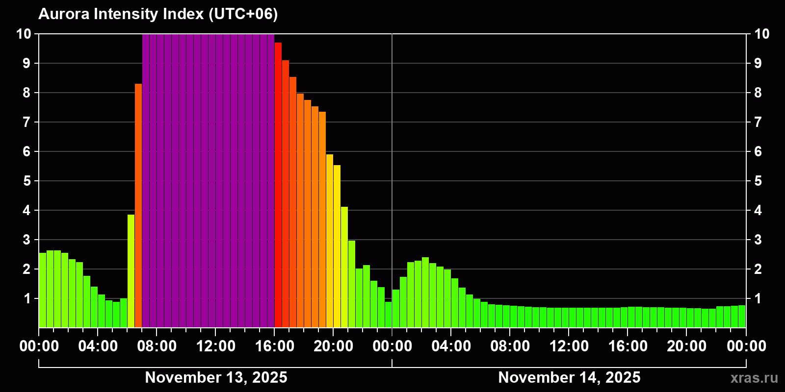 Changes in the auroral intensity index from 2025-11-13 to 2025-11-14 local time