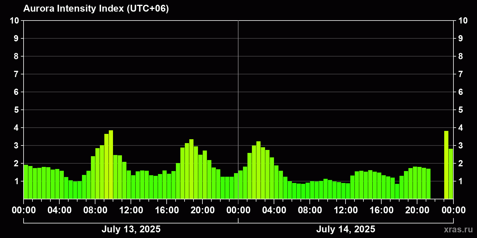 Changes in the auroral intensity index from 2025-07-13 to 2025-07-14 local time