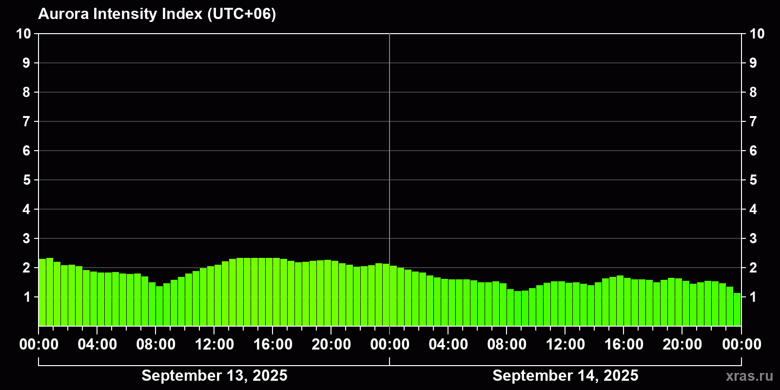 Changes in the auroral intensity index from 2025-09-13 to 2025-09-14 local time