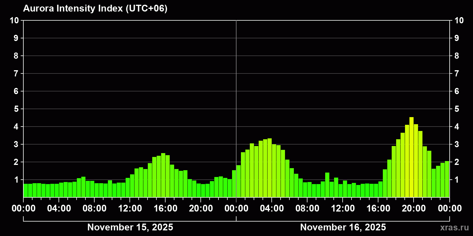 Changes in the auroral intensity index from 2025-11-15 to 2025-11-16 local time