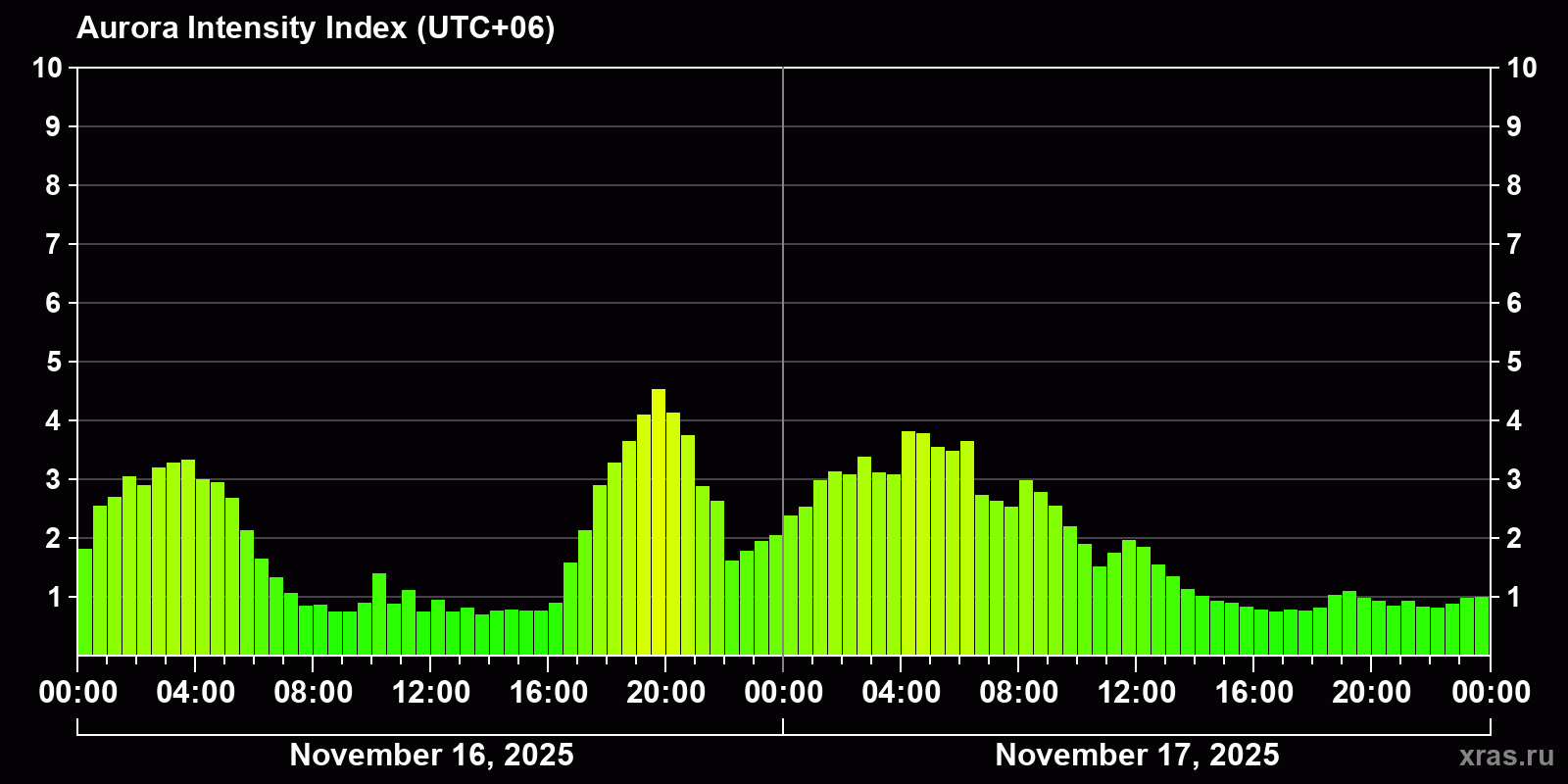 Auroral intensity index and the theoretically possible latitude of observations for nighttime in the Estern Hemisphere as of 2025-11-17 23:54 (end of day) local time
