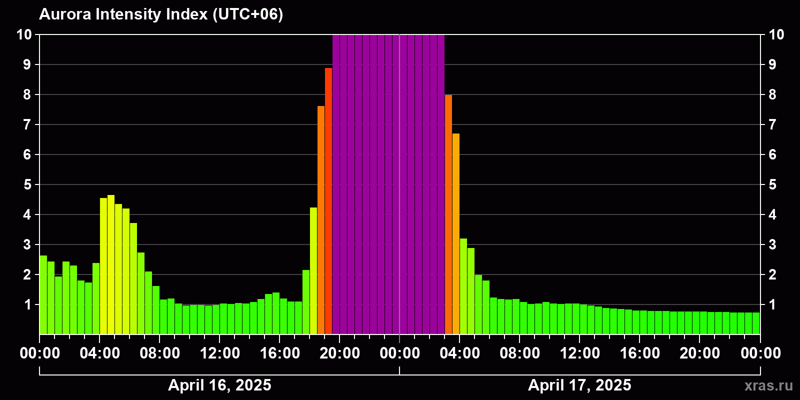 Changes in the auroral intensity index from 2025-04-16 to 2025-04-17 local time