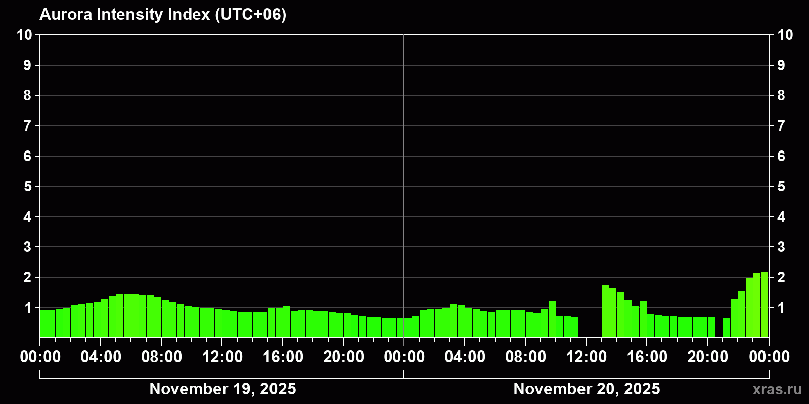 Auroral intensity index and the theoretically possible latitude of observations for nighttime in the Estern Hemisphere as of 2025-11-20 23:57 (end of day) local time
