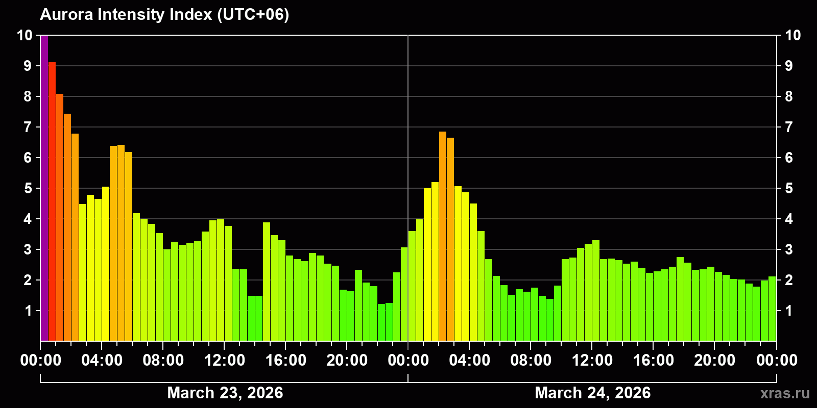 Auroral intensity index and the theoretically possible latitude of observations for nighttime in the Estern Hemisphere as of 2026-03-24 23:57 (end of day) local time