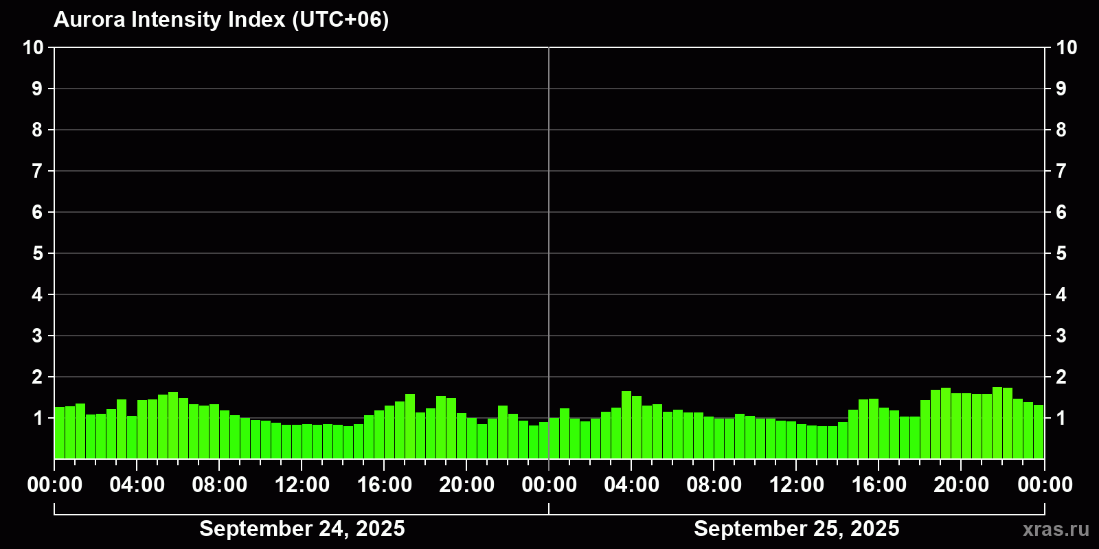 Changes in the auroral intensity index from 2025-09-24 to 2025-09-25 local time