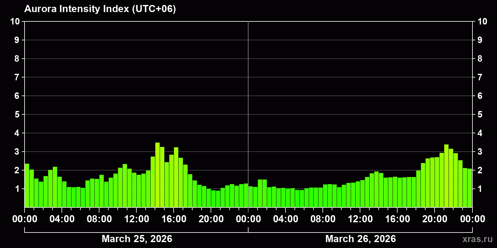 Changes in the auroral intensity index from 2026-03-25 to 2026-03-26 local time
