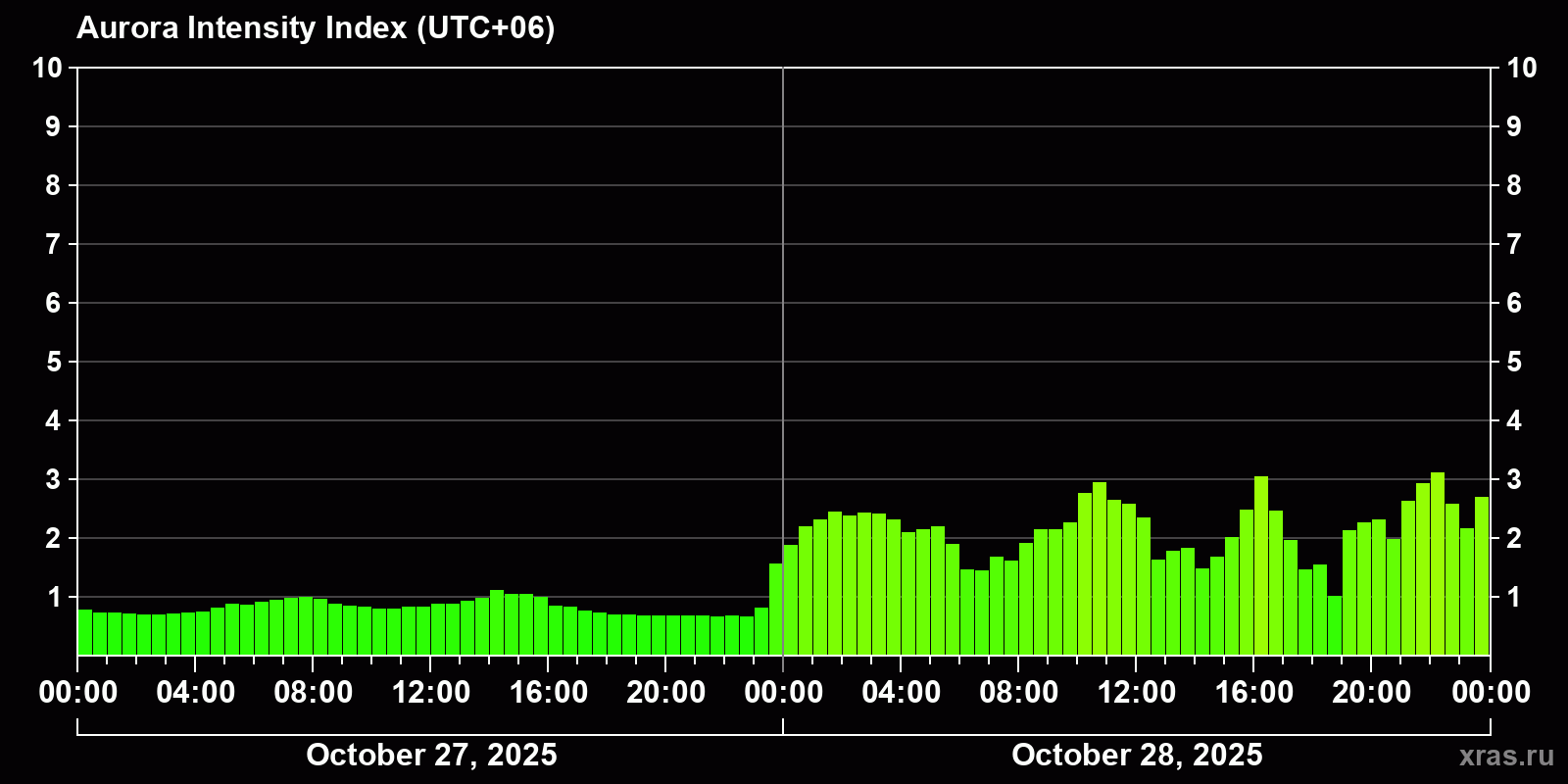 Changes in the auroral intensity index from 2025-10-27 to 2025-10-28 local time