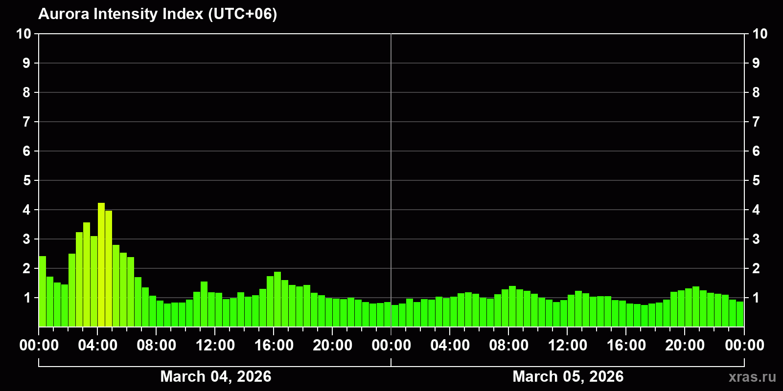Changes in the auroral intensity index from 2026-03-04 to 2026-03-05 local time