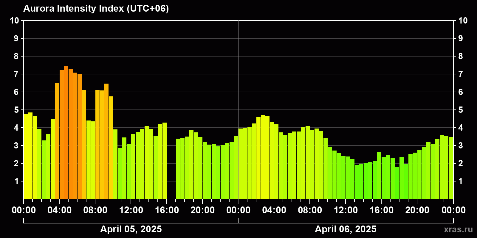 Changes in the auroral intensity index from 2025-04-05 to 2025-04-06 local time