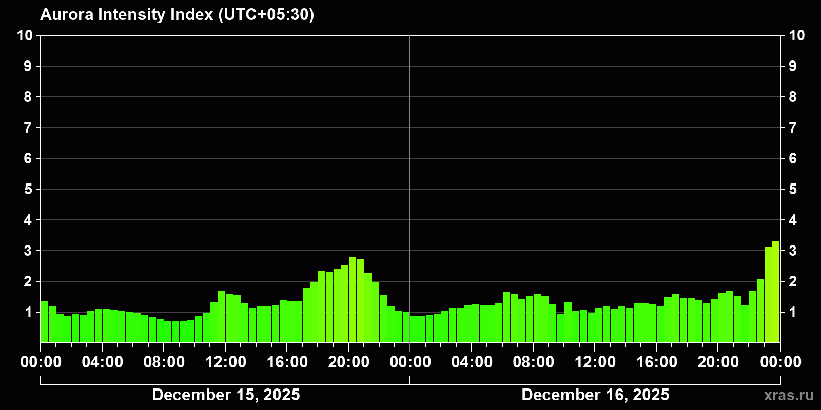 Auroral intensity index and the theoretically possible latitude of observations for nighttime in the Estern Hemisphere as of 2025-12-16 23:58 (end of day) local time