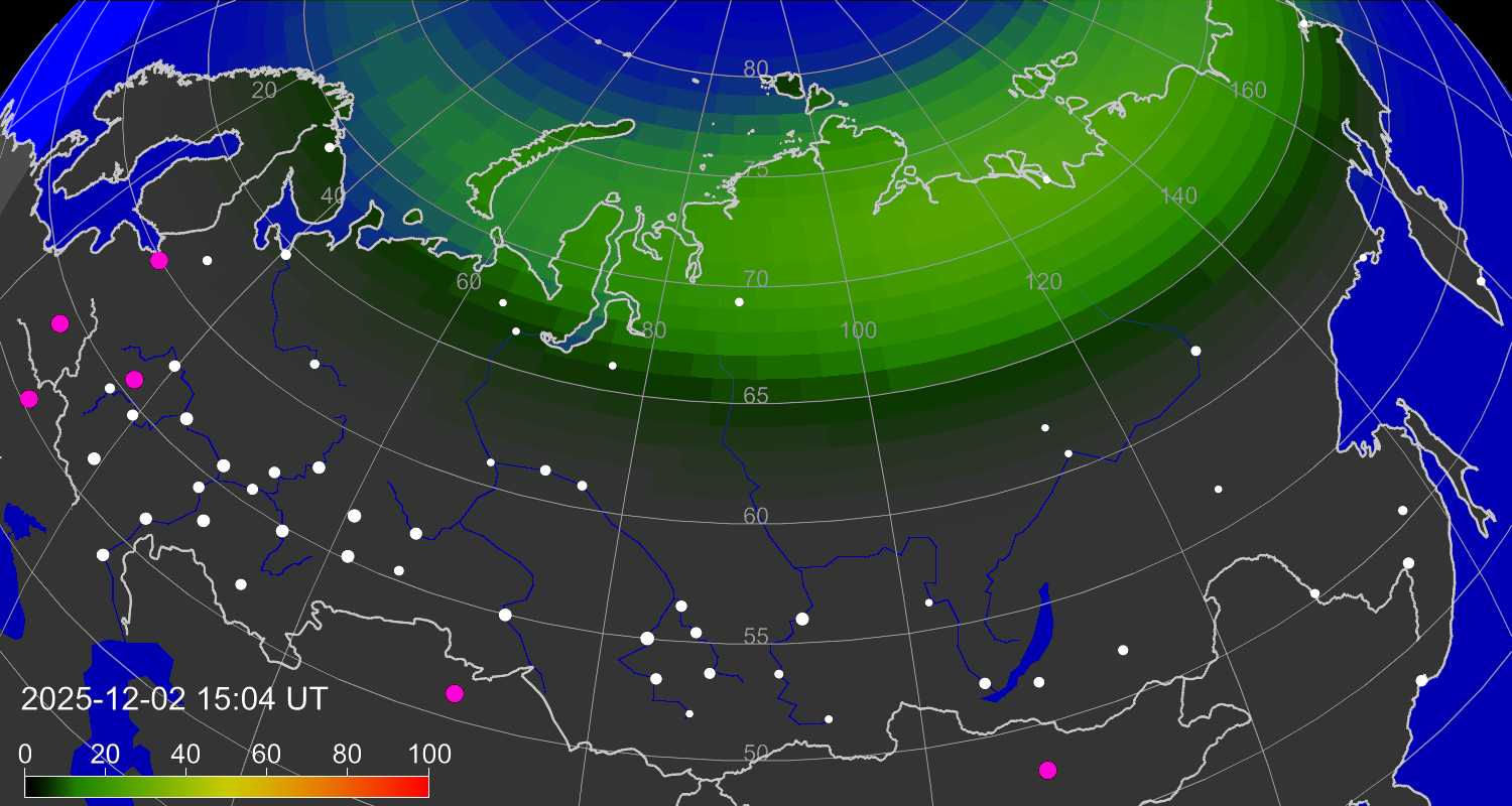 Индекс интенсивности полярных сияний и теоретически возможная широта наблюдений для ночного времени в восточном полушарии