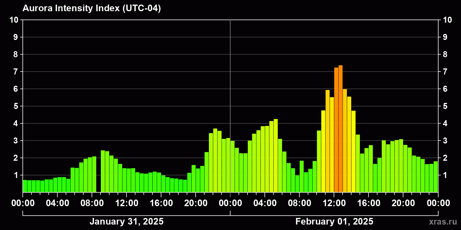 Changes in the auroral intensity index from 2025-01-31 to 2025-02-01 local time