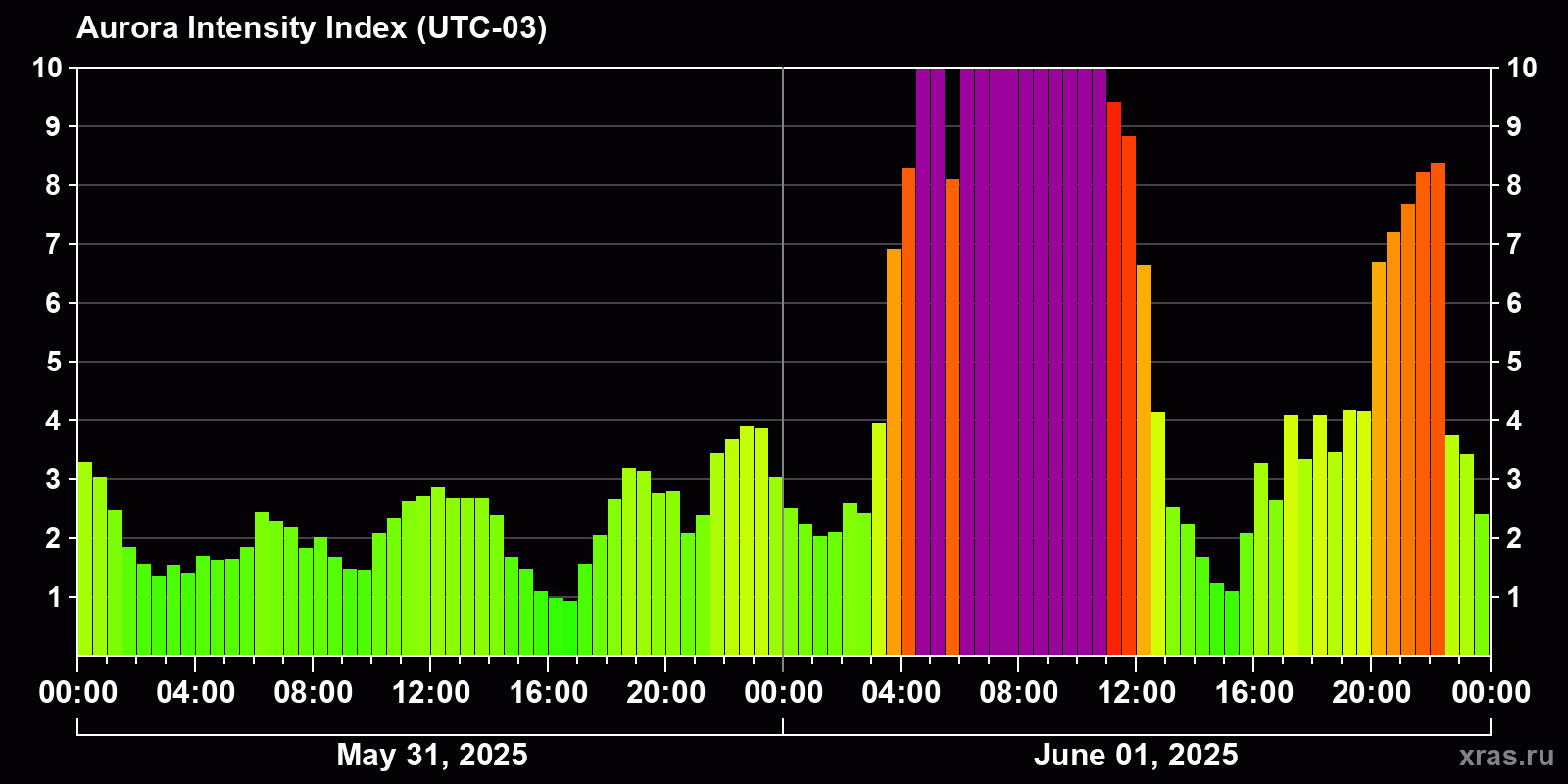 Changes in the auroral intensity index from 2025-05-31 to 2025-06-01 local time