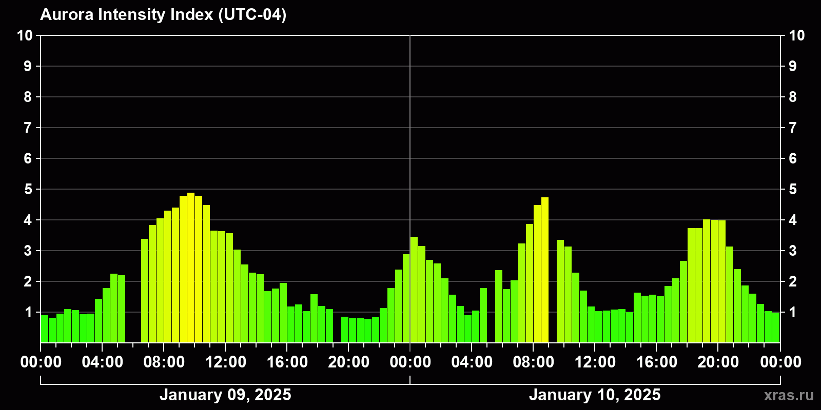 Auroral intensity index and the theoretically possible latitude of observations for nighttime in the Western Hemisphere as of 2025-01-10 23:47 (end of day) local time