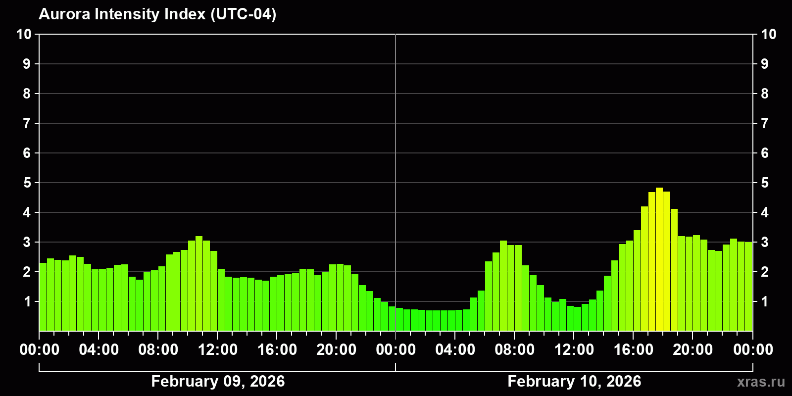 Auroral intensity index and the theoretically possible latitude of observations for nighttime in the Western Hemisphere as of 2026-02-10 23:45 (end of day) local time