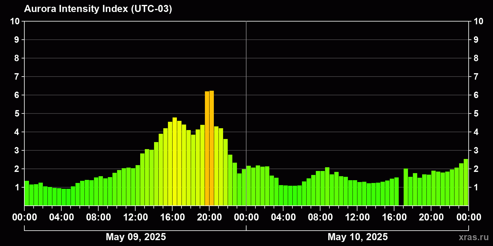 Changes in the auroral intensity index from 2025-05-09 to 2025-05-10 local time