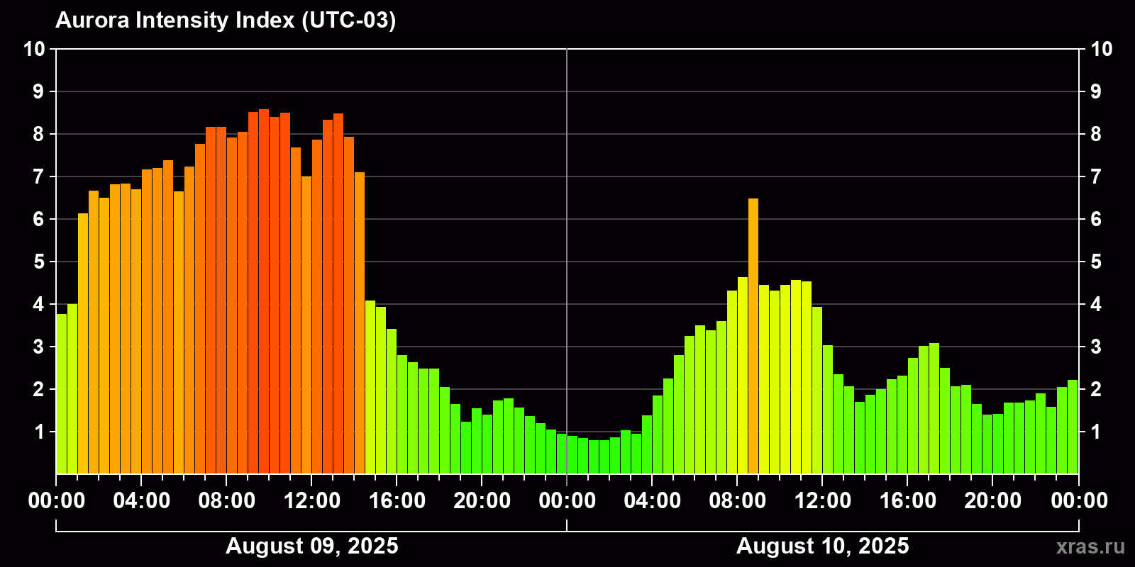 Changes in the auroral intensity index from 2025-08-09 to 2025-08-10 local time