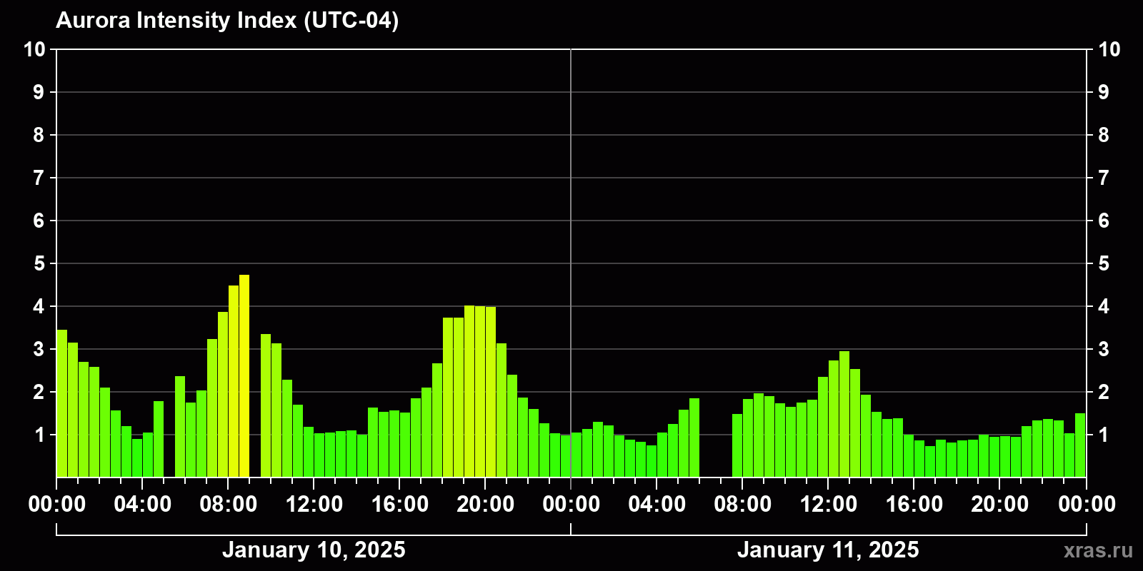 Auroral intensity index and the theoretically possible latitude of observations for nighttime in the Western Hemisphere as of 2025-01-11 23:50 (end of day) local time