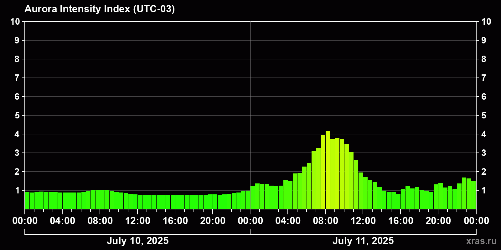 Changes in the auroral intensity index from 2025-07-10 to 2025-07-11 local time