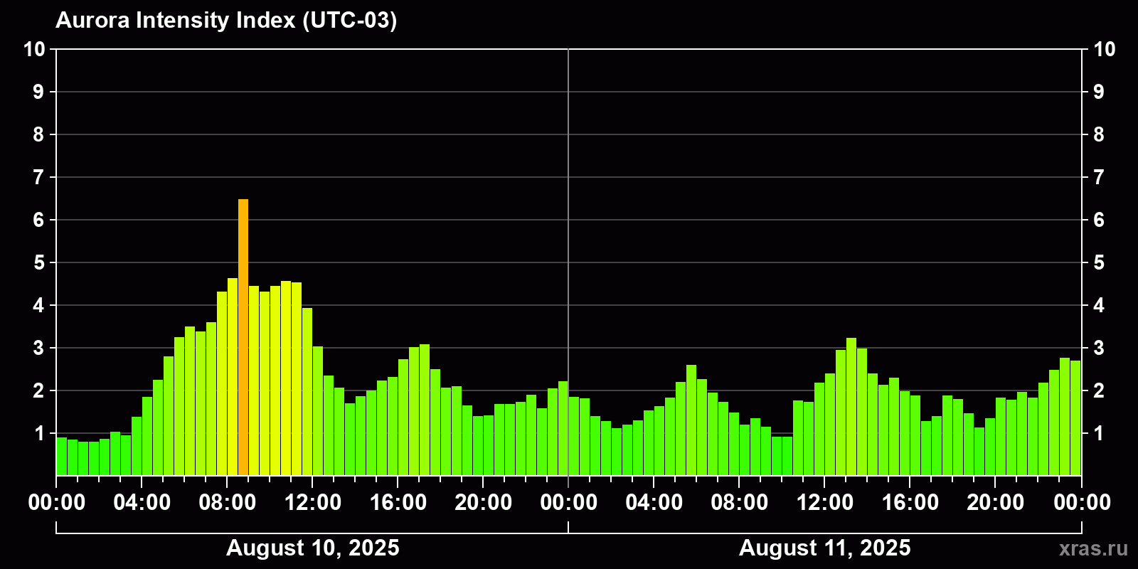 Changes in the auroral intensity index from 2025-08-10 to 2025-08-11 local time