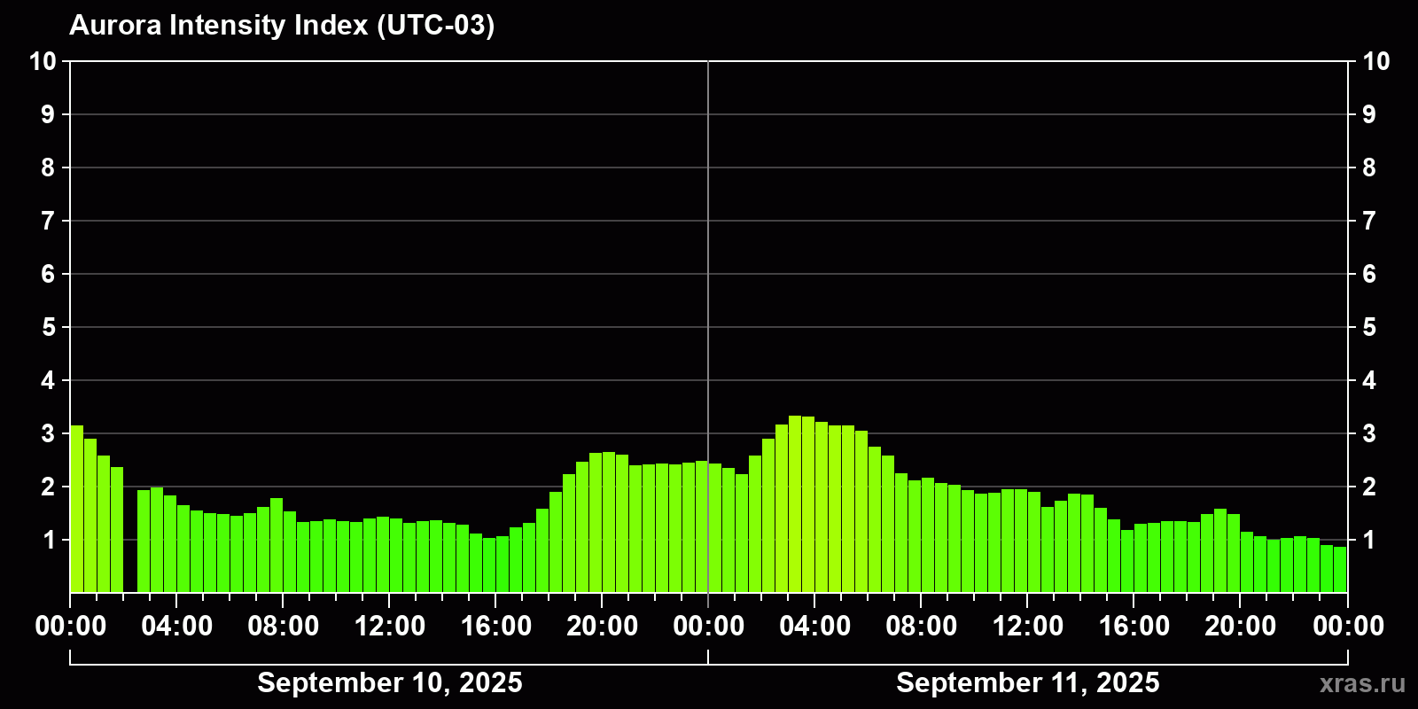 Auroral intensity index and the theoretically possible latitude of observations for nighttime in the Western Hemisphere as of 2025-09-11 23:48 (end of day) local time