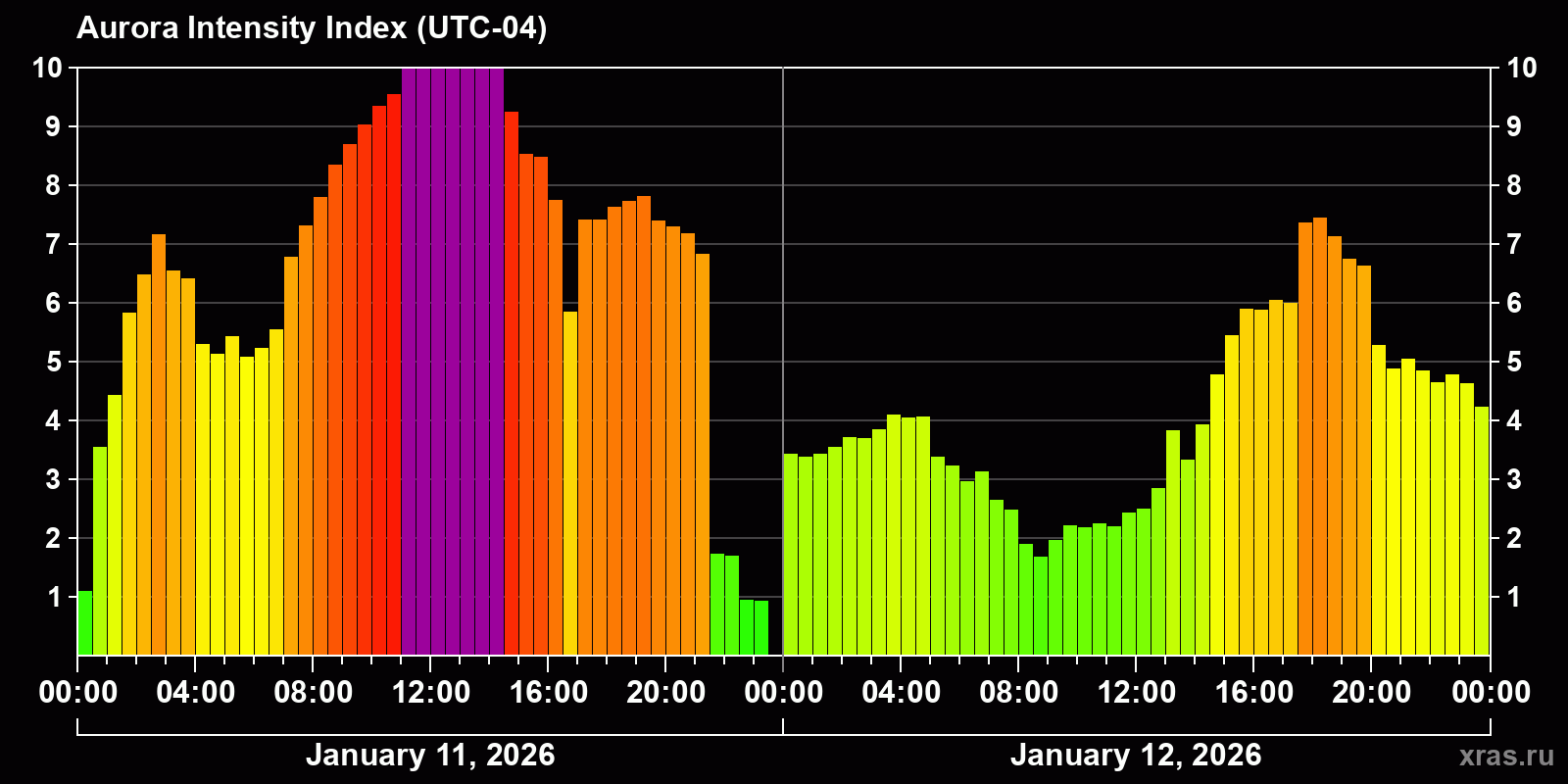 Auroral intensity index and the theoretically possible latitude of observations for nighttime in the Western Hemisphere as of 2026-01-12 23:59 (end of day) local time