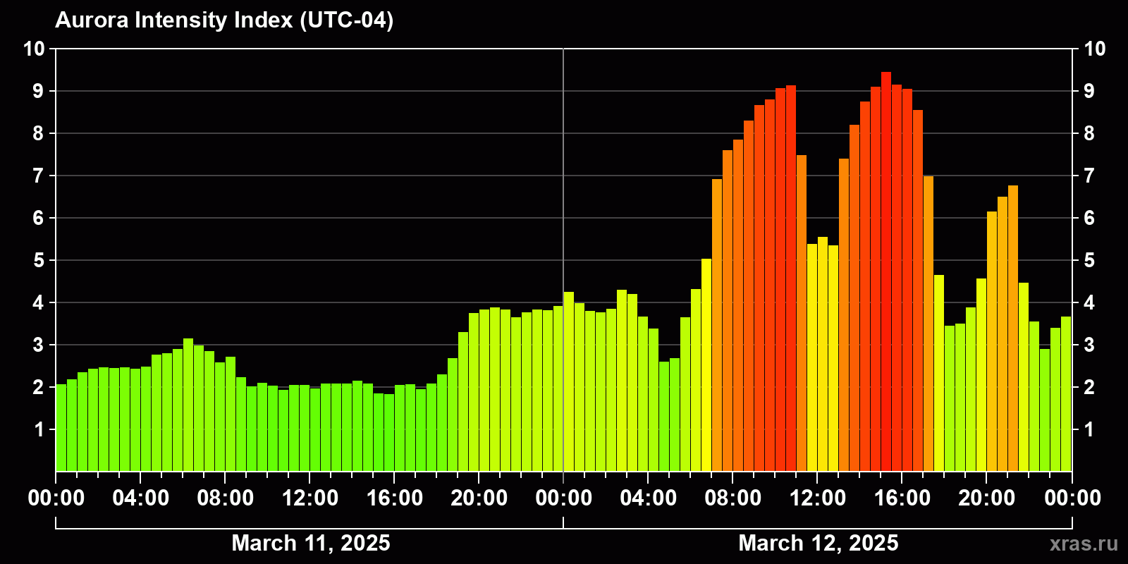 Changes in the auroral intensity index from 2025-03-11 to 2025-03-12 local time