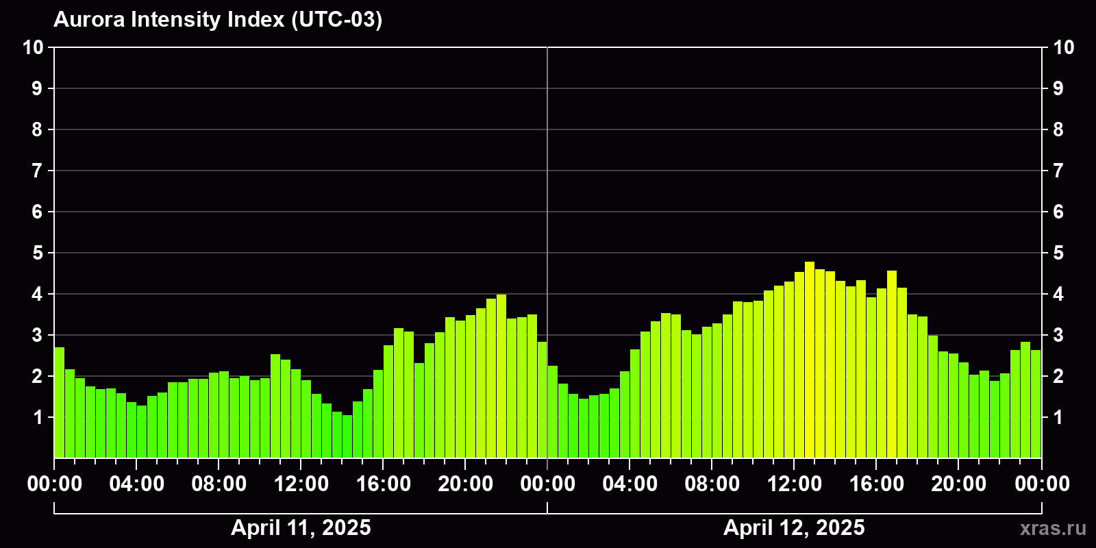 Auroral intensity index and the theoretically possible latitude of observations for nighttime in the Western Hemisphere as of 2025-04-12 23:55 (end of day) local time