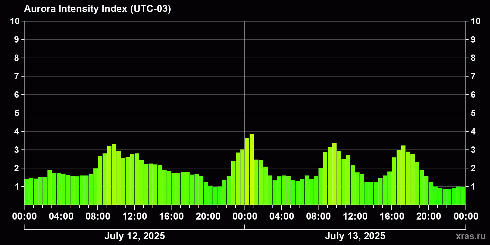 Changes in the auroral intensity index from 2025-07-12 to 2025-07-13 local time