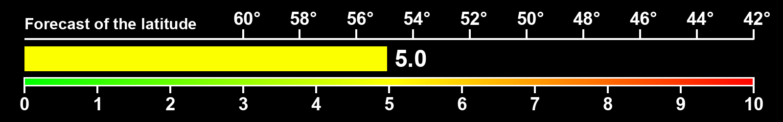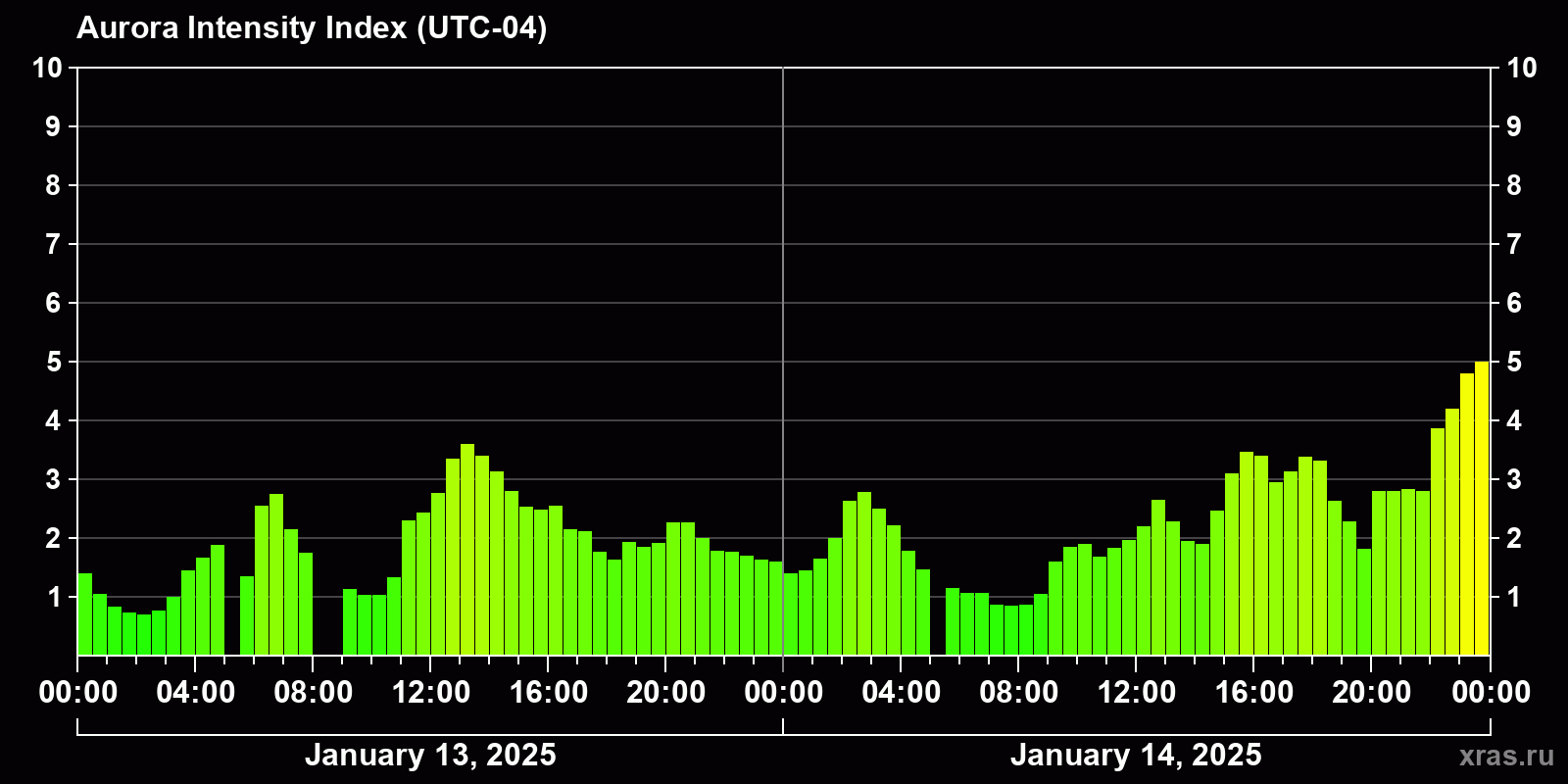 Auroral intensity index and the theoretically possible latitude of observations for nighttime in the Western Hemisphere as of 2025-01-14 23:58 (end of day) local time