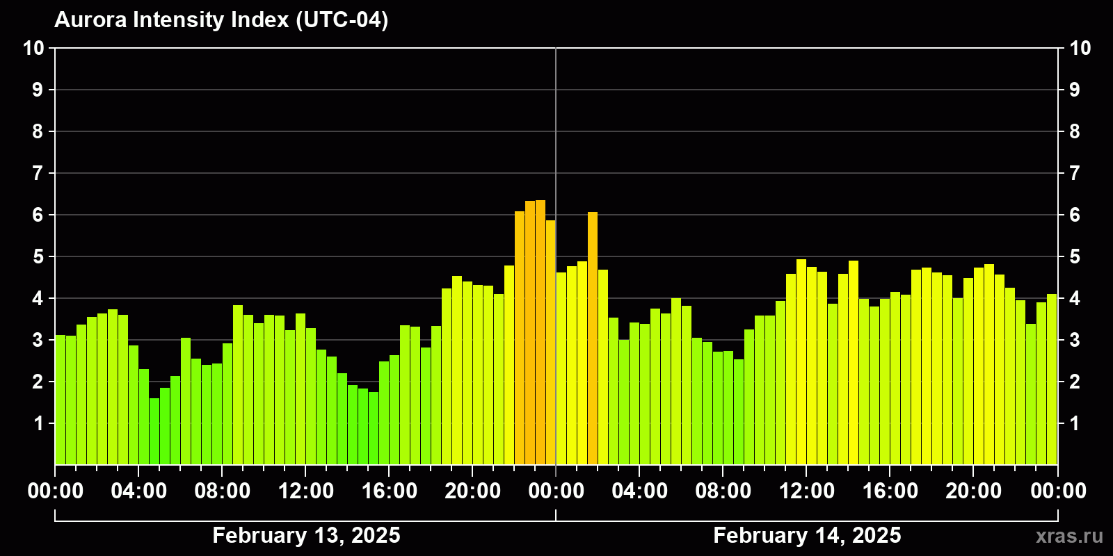 Auroral intensity index and the theoretically possible latitude of observations for nighttime in the Western Hemisphere as of 2025-02-14 23:55 (end of day) local time