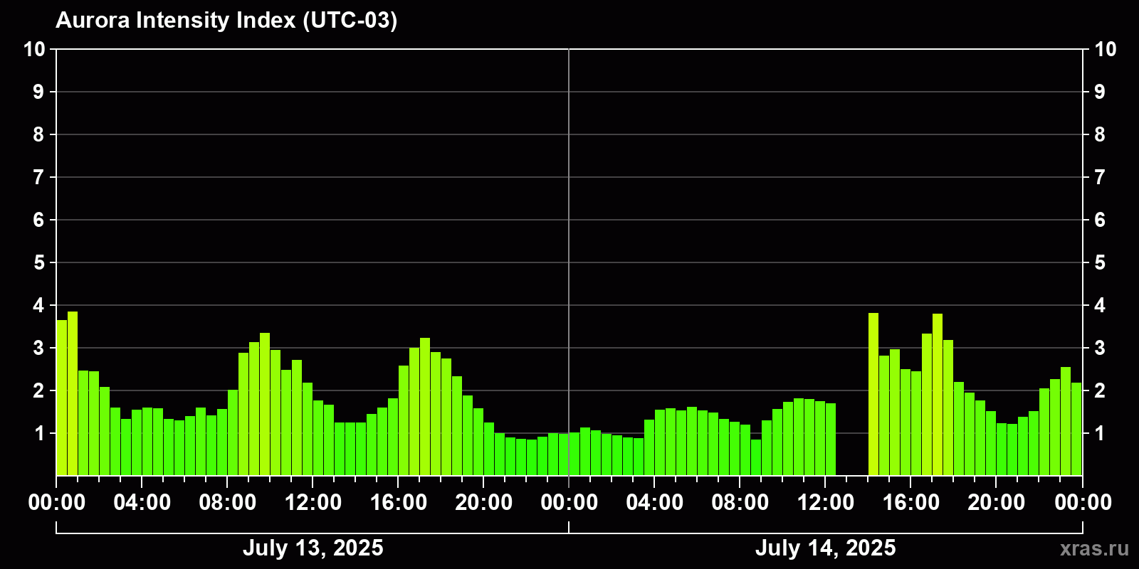 Changes in the auroral intensity index from 2025-07-13 to 2025-07-14 local time