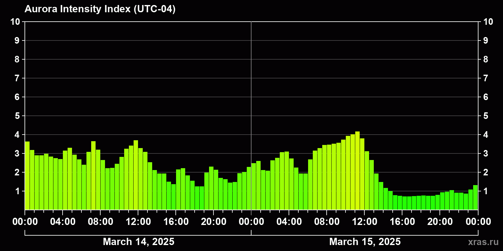 Changes in the auroral intensity index from 2025-03-14 to 2025-03-15 local time