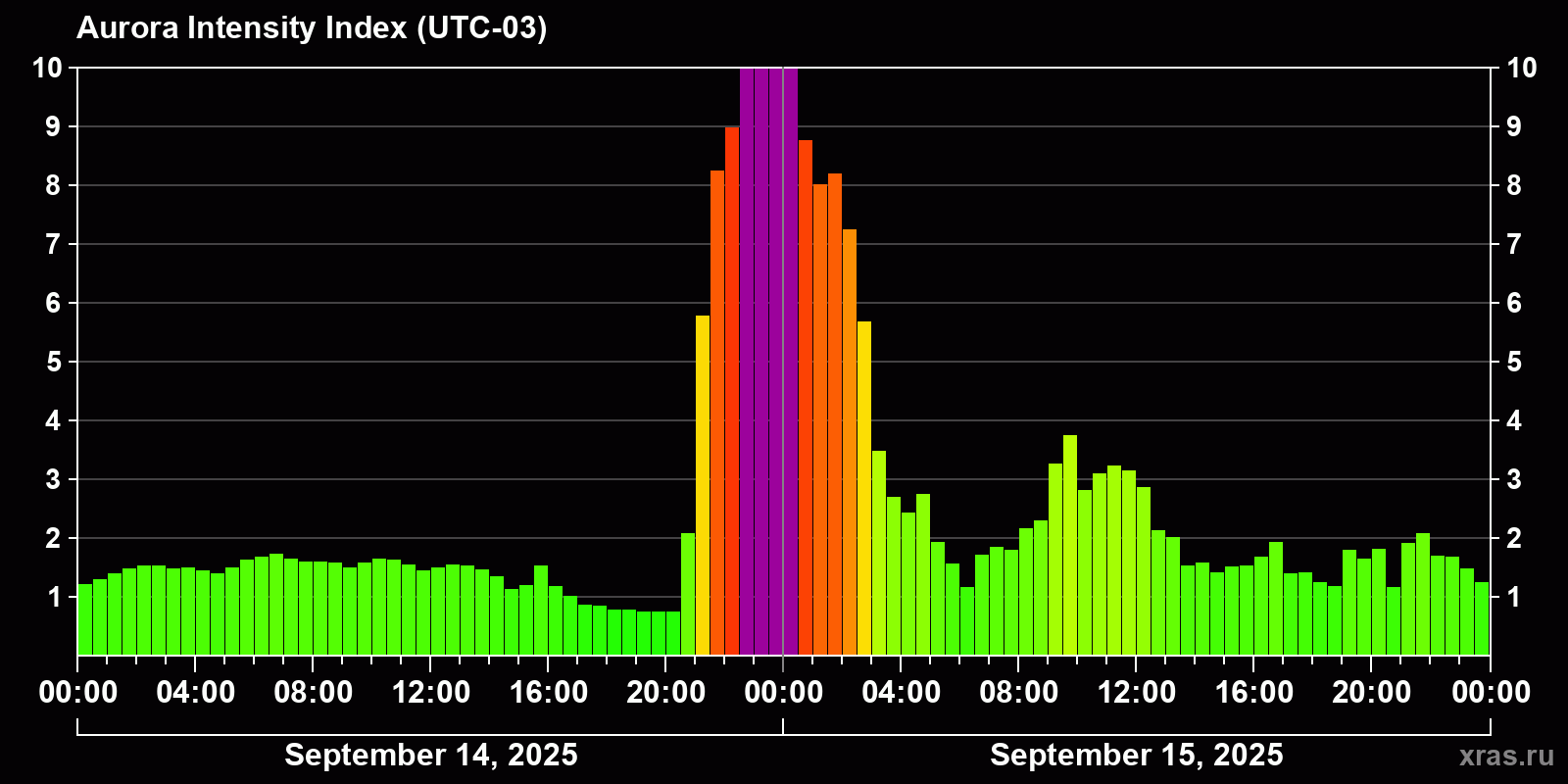Changes in the auroral intensity index from 2025-09-14 to 2025-09-15 local time