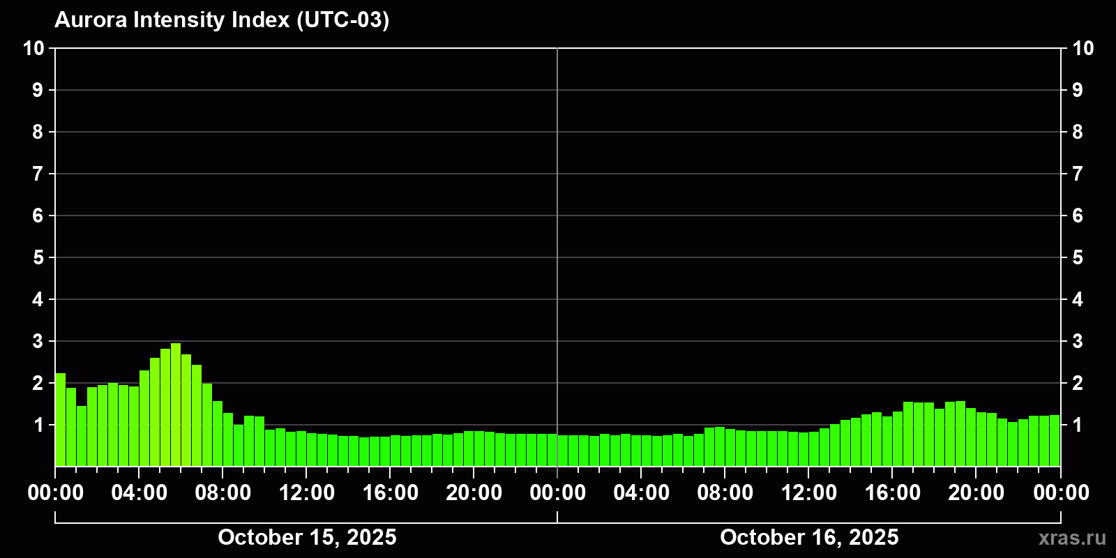 Changes in the auroral intensity index from 2025-10-15 to 2025-10-16 local time