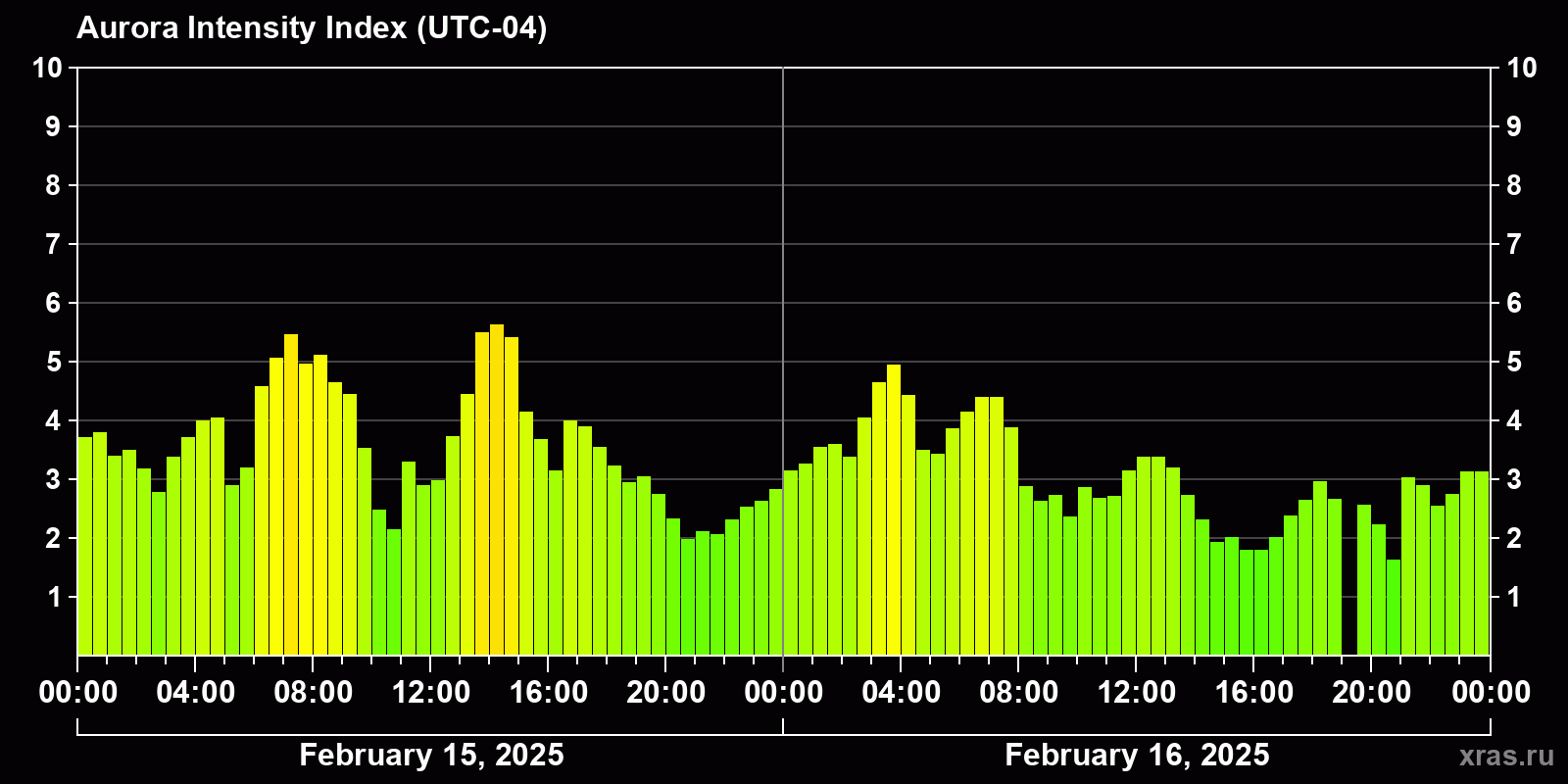 Auroral intensity index and the theoretically possible latitude of observations for nighttime in the Western Hemisphere as of 2025-02-16 23:47 (end of day) local time