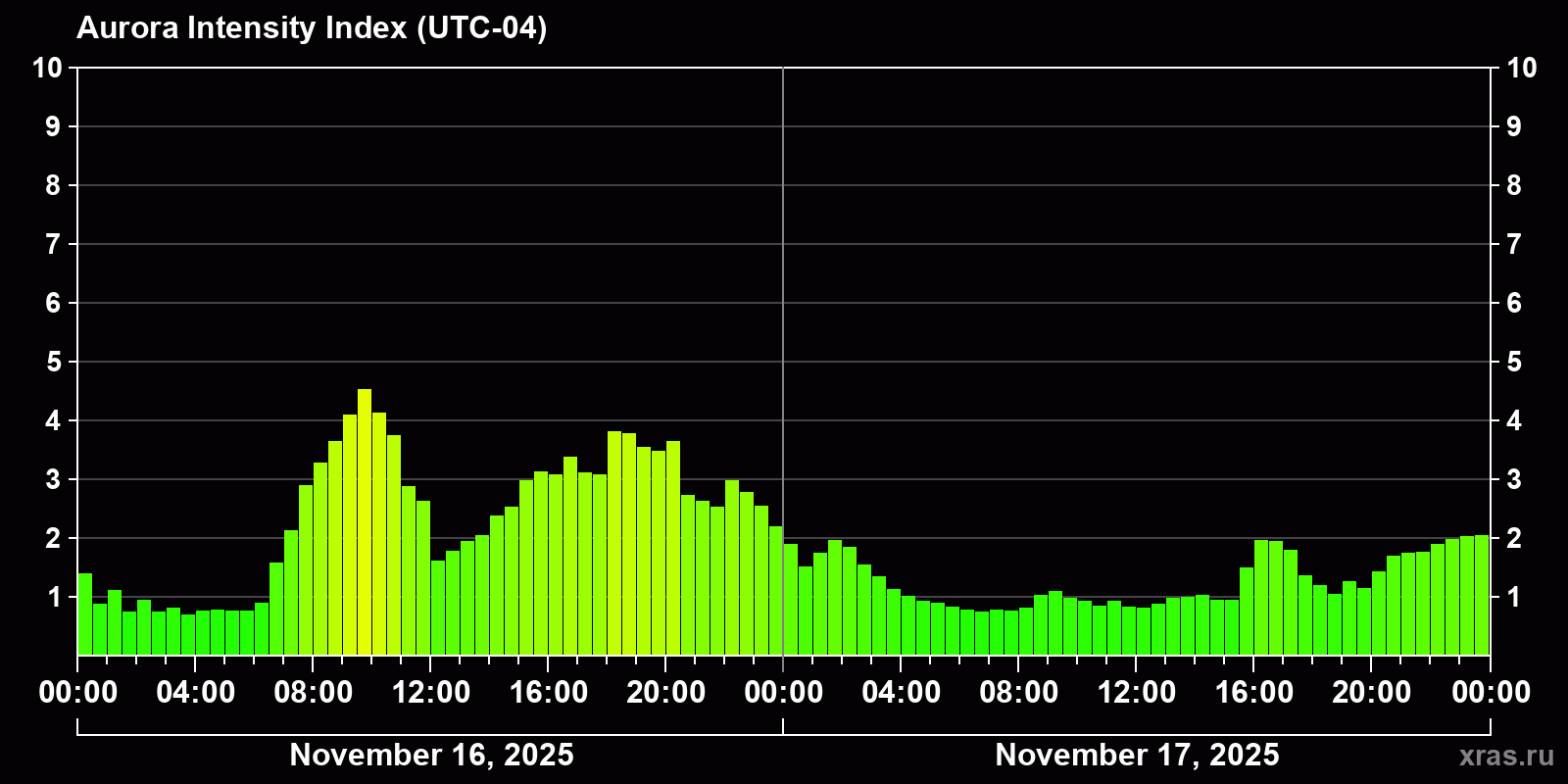 Changes in the auroral intensity index from 2025-11-16 to 2025-11-17 local time