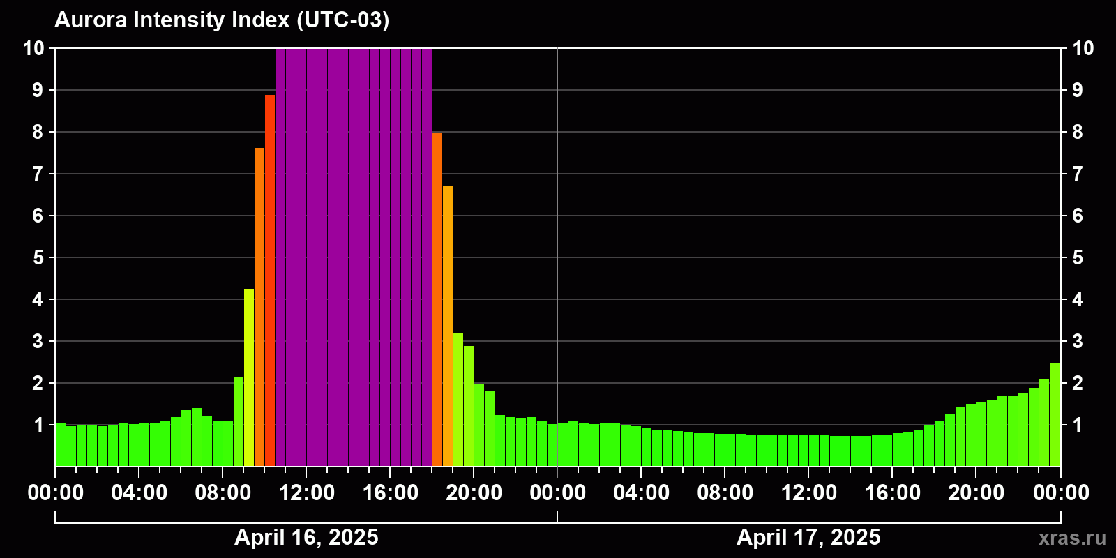Changes in the auroral intensity index from 2025-04-16 to 2025-04-17 local time