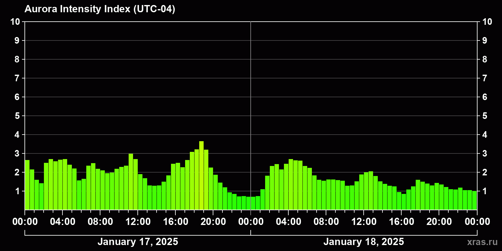Auroral intensity index and the theoretically possible latitude of observations for nighttime in the Western Hemisphere as of 2025-01-18 23:55 (end of day) local time