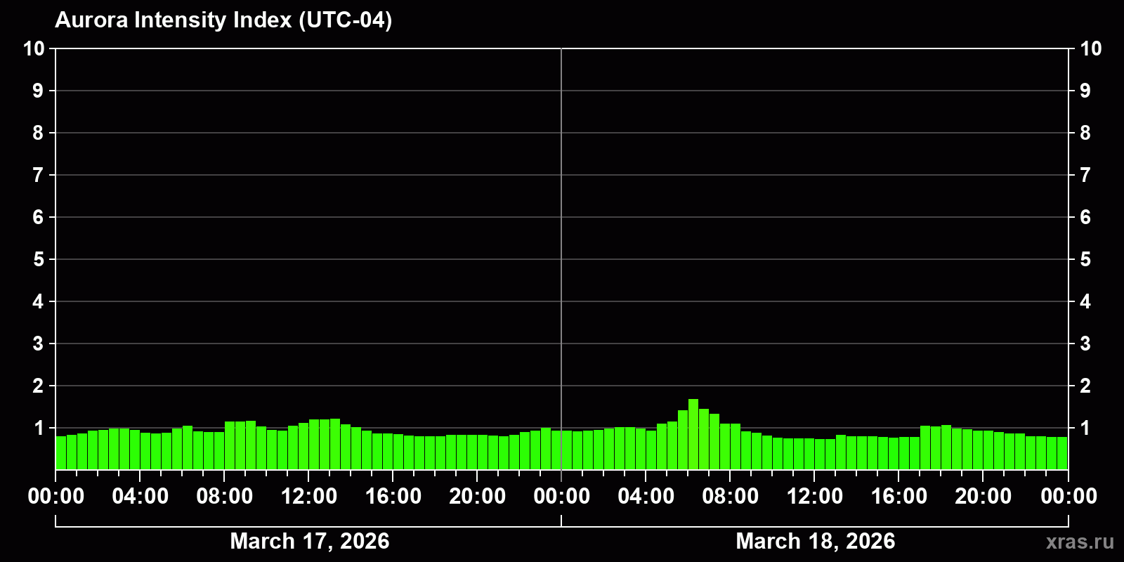 Changes in the auroral intensity index from 2026-03-17 to 2026-03-18 local time