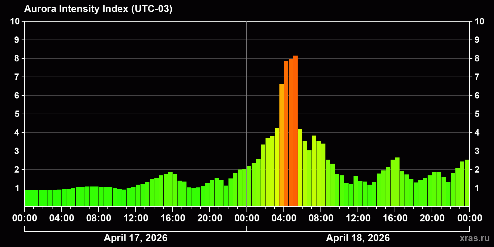 Changes in the auroral intensity index from 2026-04-17 to 2026-04-18 local time