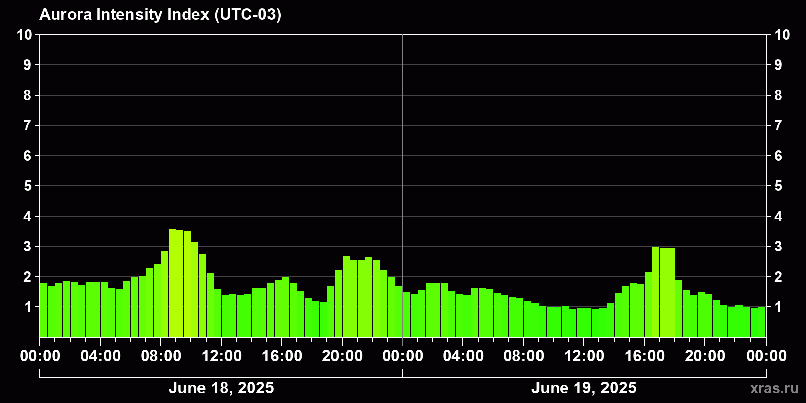 Changes in the auroral intensity index from 2025-06-18 to 2025-06-19 local time