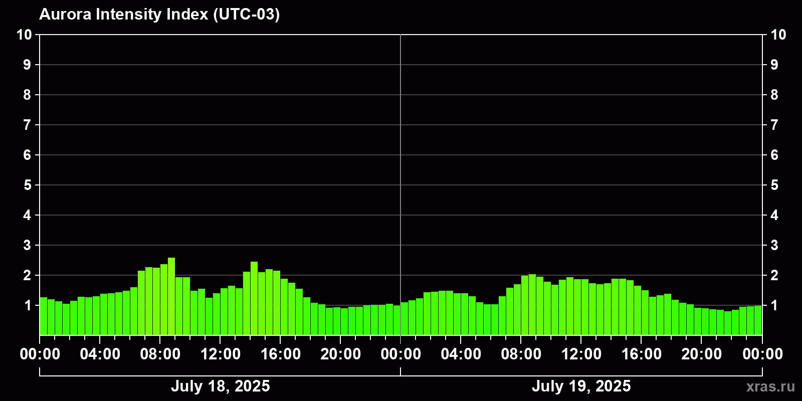 Changes in the auroral intensity index from 2025-07-18 to 2025-07-19 local time