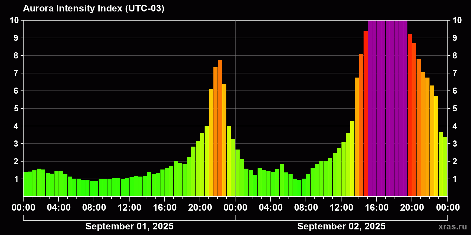 Changes in the auroral intensity index from 2025-09-01 to 2025-09-02 local time